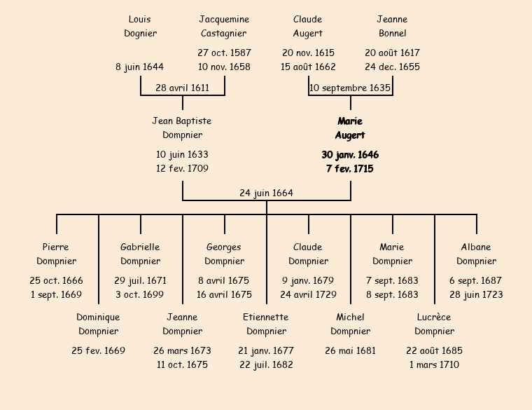Mariée (18 ans) avec Jean Baptiste Dompnier (31 ans) le 24 juin 1664 à Fontcouverte ![]() |