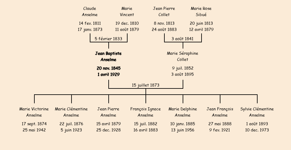 Epoux : Jean Baptiste Anselme (27 ans, né le 20 novembre1845, cultivateur aux Anselmes, a signé), fils de Claude (décédé le 17 janvier 1873) et de Marie Vincent (ménagère, n'a pas su signer) |