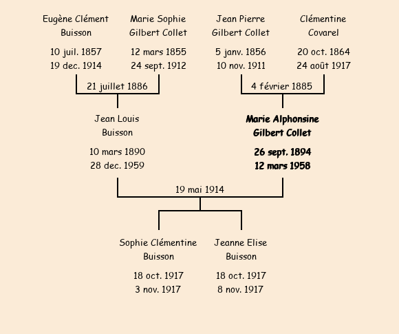 Epoux : Jean Louis Buisson (né à Fontcouverte le 10 mars1890, domicilié à Saint Pancrace), fils de Eugène (domicilié à Saint Pancrace) et de feue Sophie Gilbert Collet |