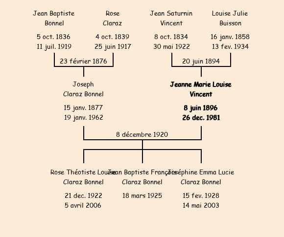 Epouse : Jeanne Marie Louise Vincent (24 ans, née à Fontcouverte le 8 juin1896, des Adrets), fille de Jean Saturnin et de Louise Julie Buisson |