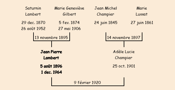 Epouse : Adèle Lucie Champier (18 ans, née à Saint Pancrace le 24 octobre1901, de Saint Pancrace), fille de feu Jean Michel et de Marie Lussat (domiciliée à Saint Pancrace) |