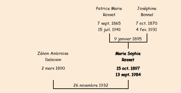Epouse : Marie Sophie Rossat (35 ans, née le 15 octobre1897 à Fontcouverte, du Chef Lieu), fille de Patrice (du Chef Lieu) et de feue Joséphine Bonnel |