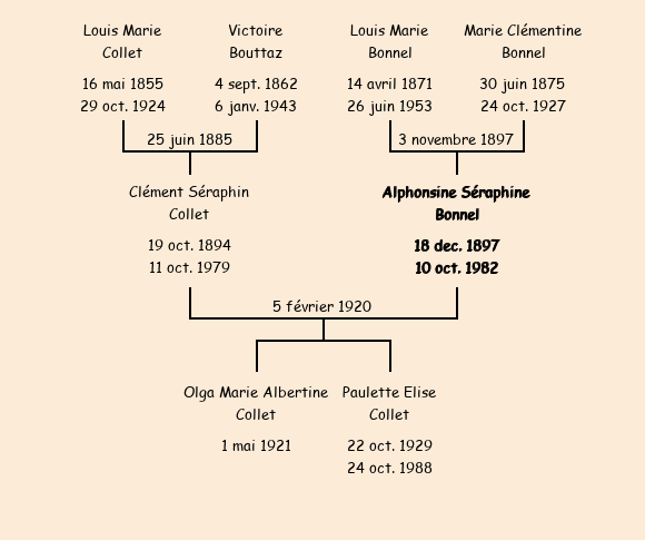 Epoux : Clément Séraphin Collet (25 ans, né le 19 octobre1894 à Fontcouverte et domicilié à Fontcouverte), fils de Louis Marie et de Victoire Bouttaz |