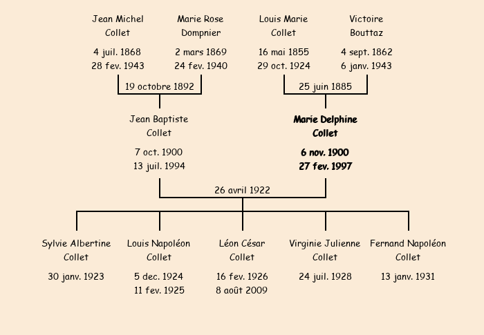 Epouse : Marie Delphine Collet (21 ans, née à Fontcouverte le 6 novembre1900, de La Rochette), fille de Louis Marie et de Victoire Bouttaz |