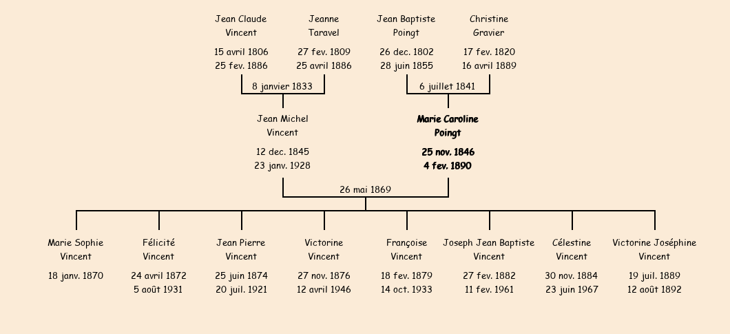 Epouse : Marie Caroline Poingt (22 ans, née le 25 novembre1846, du Crêt, cultivatrice, n'a pas su signer), fille de Jean Baptiste (décédé le 28 juin1854) et de Christine Gravier (ménagère, n'a pas su signer) |