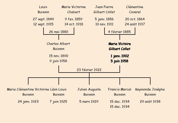 Epouse : Marie Victoire Gilbert Collet (20 ans, née à Fontcouverte le 1er février1902, de La Rochette), fille de feu Jean Pierre et de feue Clémentine Covarel |