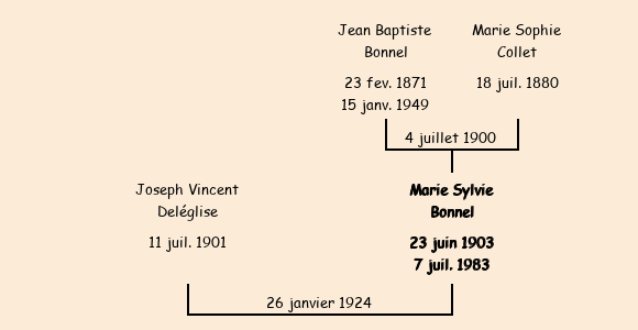 Epouse : Marie Sylvie Bonnel (20 ans, née le 23 juin1903, de La Bise), fille de Jean Baptiste et de Marie Sophie Collet |