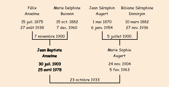 Epoux : Jean Baptiste Anselme (30 ans, né à Fontcouverte le 30 juillet1903), fils de Félix et de Marie Delphine Buisson |
