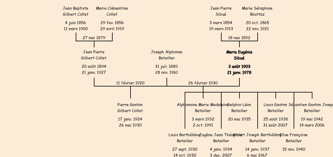Epouse : Marie Eugénie Sibué (26 ans, née à Fontcouverte le 3 août1903, de L'Alpettaz, veuve de Jean Pierre Gilbert Collet depuis le 21 janvier 1927), fille de feu Jean Pierre et de feue Marie Séraphine Bouttaz |