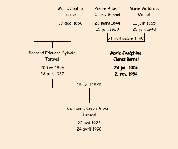 Epouse : Marie Joséphine Claraz Bonnel (17 ans, née à Fontcouverte le 24 juillet1904, de La Crousaz), fille de feu Pierre Albert et de Marie Victorine Miquet |