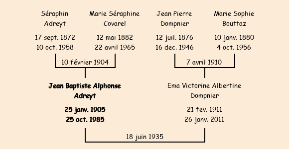 Epouse : Ema Victorine Albertine Dompnier (24 ans, née à Fontcouverte le 21 février1911, du Chef Lieu), fille de Jean Pierre et de Marie Sophie Bouttaz |