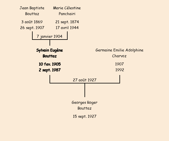 Epouse : Germaine Emile Adolphine Charvoz (20 ans, née à Saint Michel de Maurienne le 10 février1907, domiciliée à La Bise, institutrice), fille de Vincent Sixte ( domicilié à Saint Georges d'Hurtières, garde des Eaux et Forêts) et de Marie Rosalie Bertrand |