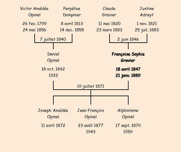 Epoux : Daniel Opinel (28 ans, né le 18 octobre1842 à Albiez le Vieu, taillandier à Gévoudaz Albiez le Vieux, a signé), fils de Victor Amédée (décédé, le 24 mai1856 à Albiez le Vieux, coutelier) et de Perpétue Dompnier (décédée le 14 décembre1858 à Albiez le Vieux) |