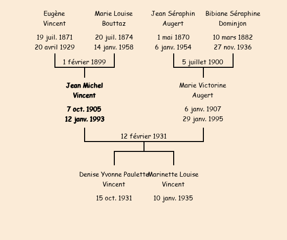 Epoux : Jean Michel Vincent (25 ans, né à Fontcouverte le 7 octobre1905, domicilié à La Bise), fils de feu Eugène et de Marie Louise Bouttaz |