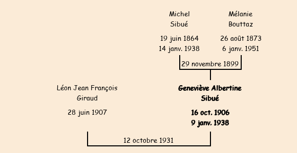 Epouse : Genevière Albertine Sibué (24 ans, née à Fontcouverte le 16 octobre1906, de Réortier Dessus), fille de Michel et de Mélanie Bouttaz |
