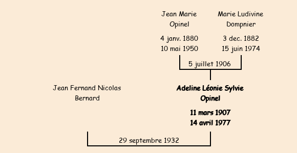 Epouse : Adeline Léonie Sylvie Opinel (25 ans, née le 11 mars1907 à Fontcouverte, domiciliée au Plan des Roi, institutrice), fille de Jean Marie (domicilié à Fontcouverte, industriel) et de Marie Divine Dompnier |