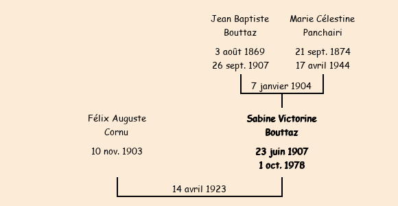 Epoux : Félix Auguste Cornu (19 ans, né à Saint Jean de Maurienne le 10 novembre1903, domicilié à Saint Jean de Maurienne lieudit La Combe, mécanicien), fils de Irénée Dominique et de Céline Célestine Dompnier |