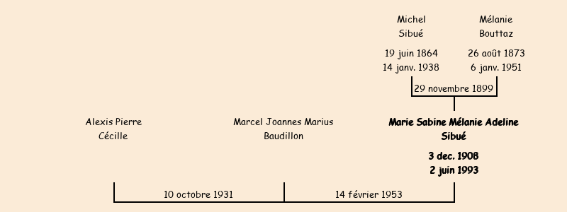 Epouse : Marie Sabine Mélanie Adeline Sibué (22 ans, née à Fontcouverte le 3 décembre1908, de Réortier Dessus), fille de Michel et de Mélanie Bouttaz |