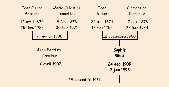 Epoux : Jean Baptiste Anselme (24 ans, né à Saint Jean de Maurienne le 10 avril1907, domicilié à Saint Jean de Maurienne rue de la Sous-Prefecture, charpentier), fils de feu Jean Pierre et de Marie Célestine Romettaz (domiciliée à Saint Jean de Maurienne rue de la Sous-Prefecture) |