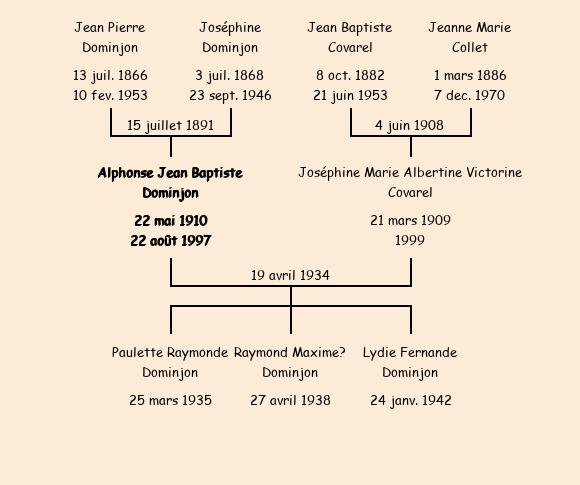 Epoux : Alphonse Jean Baptiste Dominjon (23 ans, né à Fontcouverte le 22 mai1910, domicilié à Pierrepin), fils de Jean Pierre et de Joséphine Dominjon |