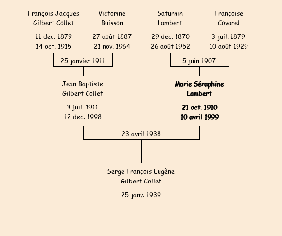 Epouse : Marie Séraphine Lambert (27 ans, née à Fontcouverte le 21 octobre1910, de La Rochette), fille de Saturnin et de feue Françoise Covarel |