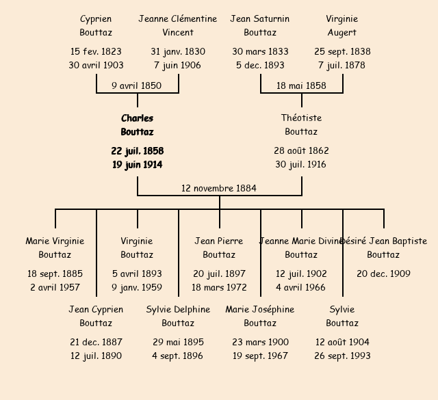 Epoux : Charles Bouttaz (26 ans, né le 22 juillet1858, cultivateur à Riortier dessus, a signé), fils de Cyprien (cultivateur, a signé) et de Jeanne Clémentine Vincent (cultivatrice, n'a pas su signer) |