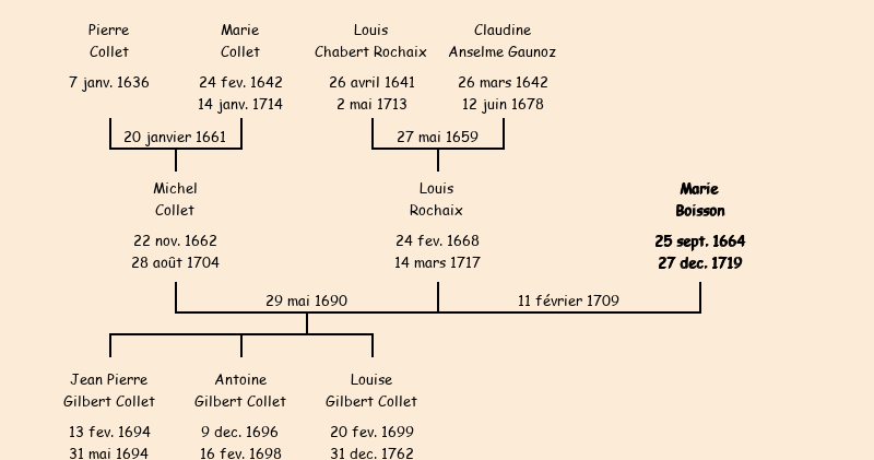 Epouse : Marie Boisson (veuve de Michel Gilbert Collet fils de Pierre), fille de feu Jean Pierre |