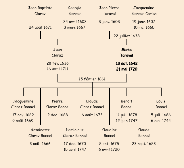 Mariée (18 ans) avec Jean Claraz (24 ans) le 15 février 1661 à Fontcouverte ![]() |