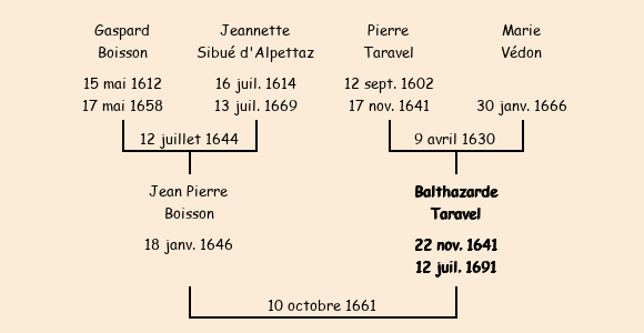 Epouse : Balthazarde Taravel, fille de feu Pierre |