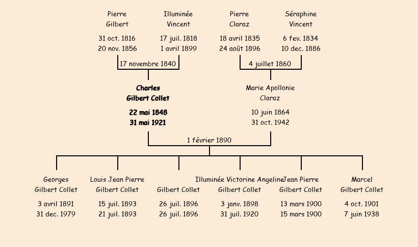Mère : Illuminée Vincent (ménagère) | Marraine : Catherine Gilbert Collet (ménagère) |