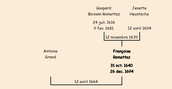 Mariée (23 ans) avec Antoine Grand le 12 avril 1664 à Saint-Jean-de-Maurienne |
