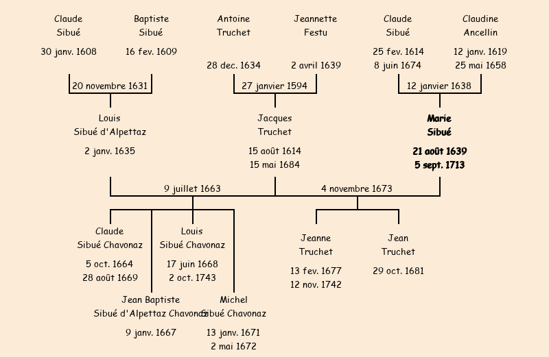 Mariée (23 ans) avec Louis Sibué d'Alpettaz (28 ans) le 9 juillet 1663 à Fontcouverte ![]() |
