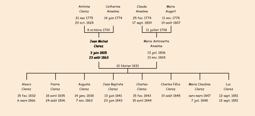 Père : Antoine Claraz, fils de Michel | Parrain : Michel Claraz (fils de Pierre, frère de la marraine) |