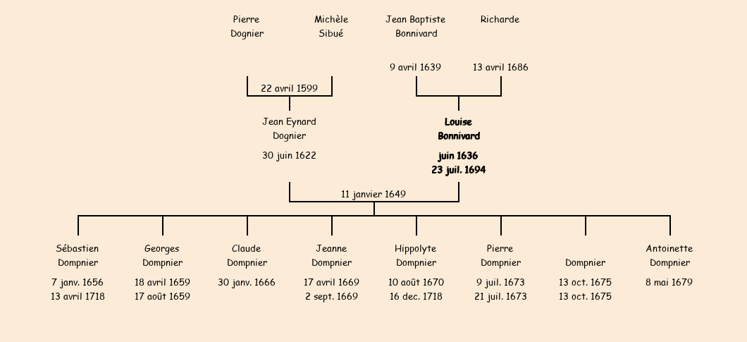 Mariée (12 ans) avec Jean Eynard Dognier (26 ans) le 11 janvier 1649 à Fontcouverte ![]() |