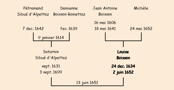 Mariée (16 ans) avec Saturnin Sibué d'Alpettaz (19 ans) le 13 juin 1651 à Fontcouverte ![]() |