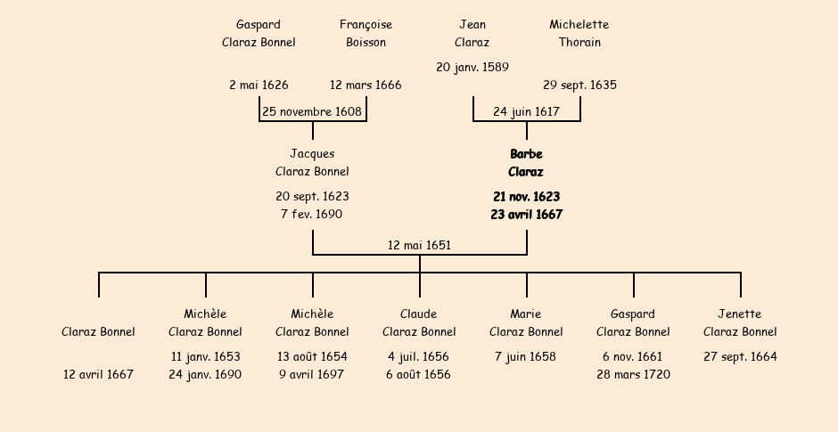 Mariée (27 ans) avec Jacques Claraz Bonnel (27 ans) le 12 mai 1651 à Fontcouverte ![]() |