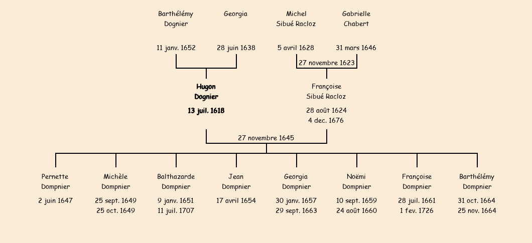 Marié (27 ans) avec Françoise Sibué Racloz (21 ans) le 27 novembre 1645 à Fontcouverte ![]() |