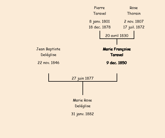 Epouse : Marie Françoise Taravel (27 ans, née le 9 décembre1850, du Rosay, cultivatrice), fille de Pierre (cultivateur, a signé) et de Rose Thorain (décédée le 17 juillet1872) |