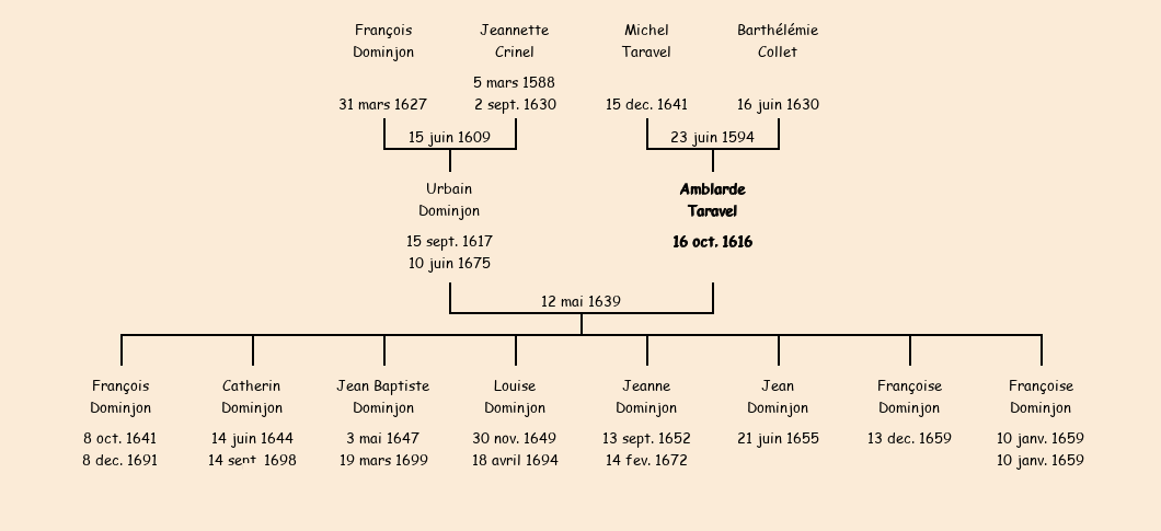 Mariée (22 ans) avec Urbain Dominjon (21 ans) le 12 mai 1639 à Fontcouverte ![]() |