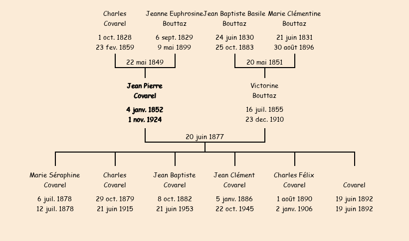 Epoux : Jean Pierre Covarel (25 ans, né le 4 janvier 1852, cultivateur à La Rochette, a signé), fils de Charles (décédé à Gènes (Italie) le 23 février1859) et de Euphrosine Bouttaz (ménagère, n'a pas su signer) |