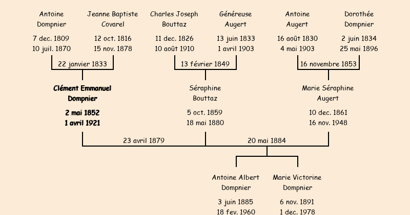Epoux : Clément Emmanuel Dompnier (32 ans, né le 3 mai1852, cultivateur au Chef Lieu, veuf de Séraphine Bouttaz à l'état religieux, a signé), fils de Antoine (décédé le 10 juillet1872 (1870)) et de Jeanne Baptiste Covarel (décédée le 12 novembre1878 (15 novembre)) |