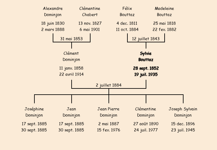 Epouse : Sylvie Bouttaz (32 ans, née le 29 septembre1852, de Pierre Pin, cultivatrice, n'a pas su signer), fille de Félix (cultivateur, a signé) et de Madeleine Bouttaz (décédée le 23 février1882 (22 février)) |