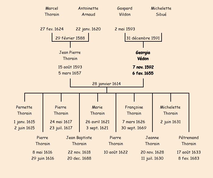 Mariée (21 ans) avec Jean Pierre Thorain (20 ans) le 28 janvier 1614 à Fontcouverte ![]() |
