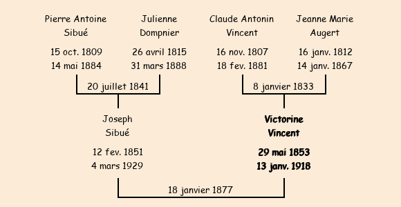 Epoux : Joseph Sibué (26 ans, né le 12 janvier 1851 (12 février), cultivateur à la Bize, a signé), fils de Pierre Antoine (cultivateur, a signé) et de Julienne Dompnier (cultivatrice, n'a pas su signer) |