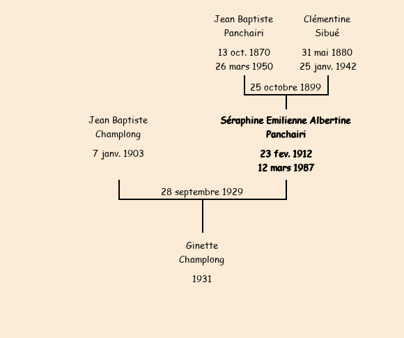 Epouse : Séraphine Emilienne Albertine Panchairi (17 ans, née à Fontcouverte le 23 février1912, de La Bise), fille de Jean Baptiste et de Clémentine Sibué |