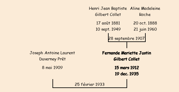 Epouse : Fernande Mariette Justine Gilbert Collet (20 ans, née à Fontcouverte le 15 mars1912, de Sur la Roche), fille de Irénée Jean Baptiste et de Aline Magdeleine Roche |