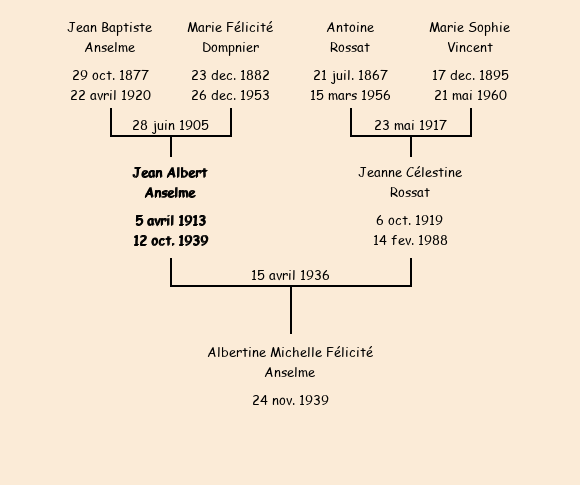 Epouse : Jeanne Célestine Rossat (16 ans, née à Fontcouverte le 6 octobre1919, de La Curiaz), fille de Antoine et de Marie Sophie Vincent |