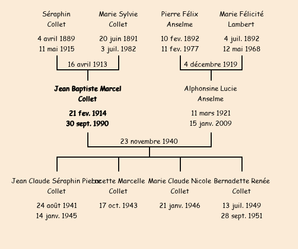 Epoux : Jean Baptiste Marcel Collet (26 ans, né à Fontcouverte le 21 février1914, domicilié à Planchamp), fils de feu Séraphin et de Marie Sylvie Collet |