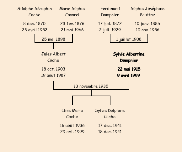 Epouse : Sylvie Albertine Dompnier (20 ans, née à Fontcouverte le 2 mai1915, des Enversets), fille de feu Ferdinand et de Sophie Joséphine Bouttaz |