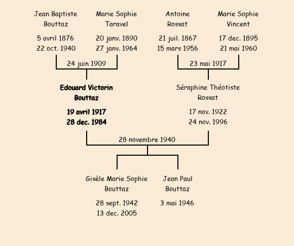 Epoux : Edouard Victorin Bouttaz (23 ans, né à Fontcouverte le 19 avril1917, domicilié au Chef Lieu), fils de feu Jean Baptiste et de Sophie Taravel |